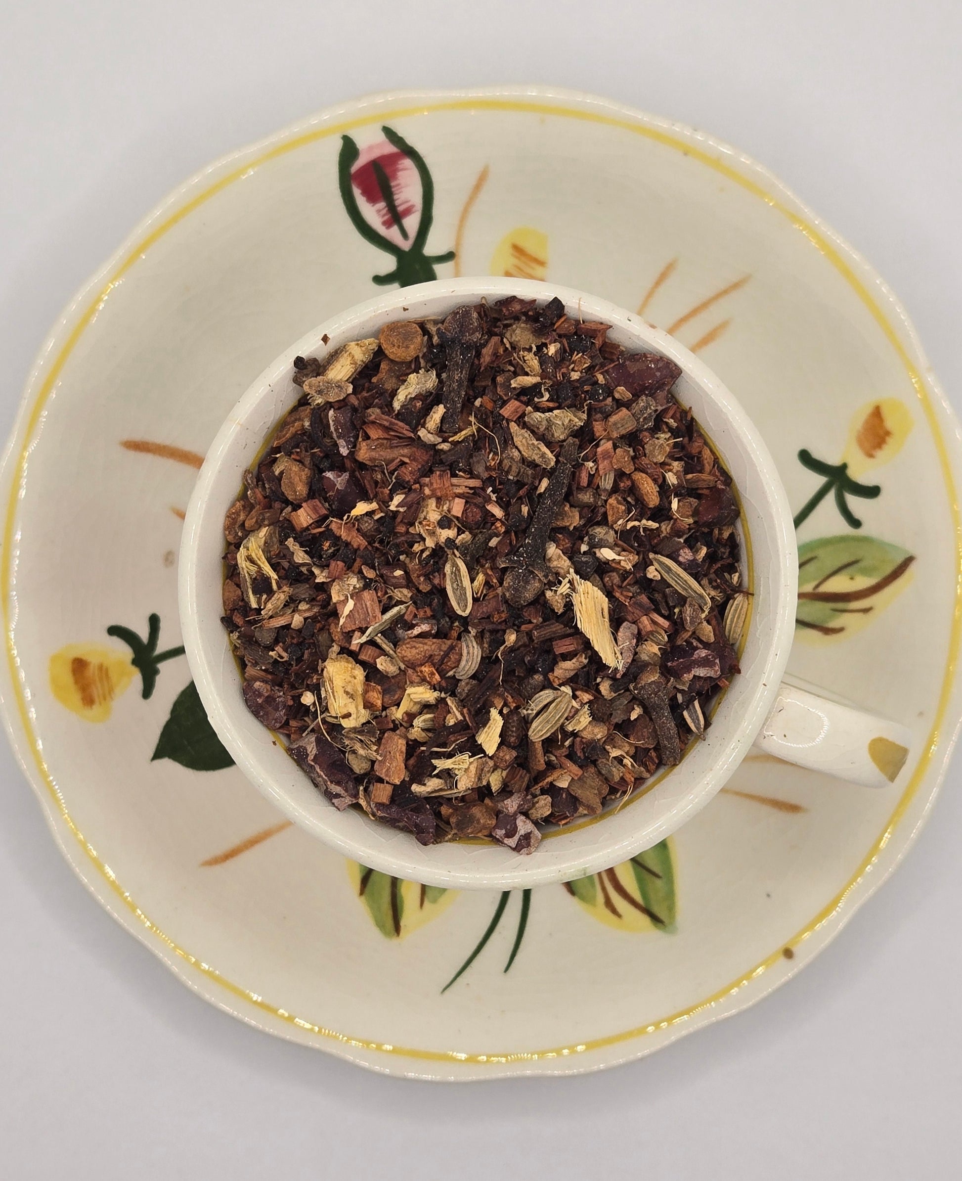 A bold, spiced herbal chai with roasted chicory and cacao.